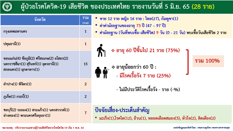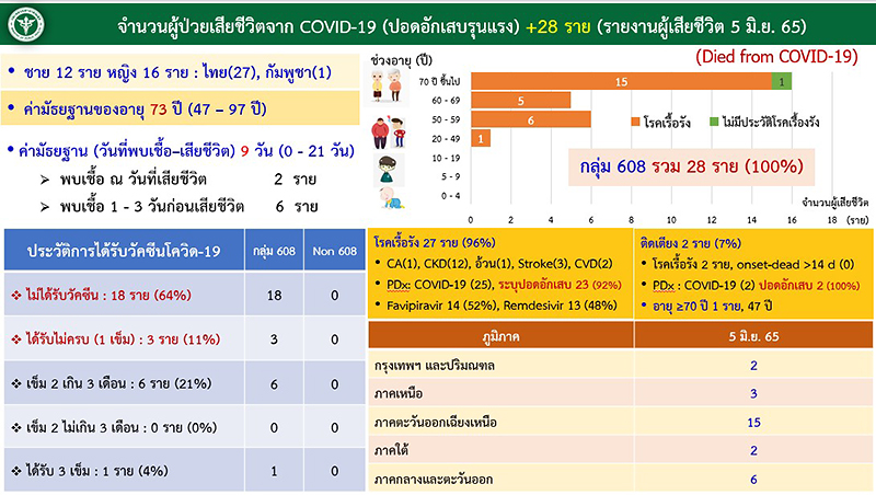 ด้านผู้เสียชีวิต 28 ราย มาจาก กทม. 1 ราย ปริมณฑล 1 ราย ภาคตะวันออกเฉียงเหนือ 15 ราย ภาคเหนือ 2 ราย ภาคใต้ 2 ราย และภาคกลาง 7 ราย เป็นกลุ่ม 608 คิดเป็น 100% จำแนกเป็น ผู้มีอายุมากกว่า 60 ปี 21 ราย คิดเป็น 75% ป่วยเรื้อรัง 7 ราย คิดเป็น 25%