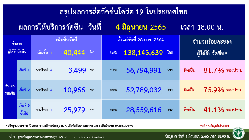 ขณะที่ การกระจายวัคซีนในประเทศ พบผู้ที่ได้รับผู้ที่ได้รับวัคซีนเข็มที่ 1 เพิ่มเติม จำนวน 3,499 ราย ผู้ได้รับเข็มที่ 2 จำนวน 10,966 ราย และผู้ได้รับเข็มที่ 3 จำนวน 25,979 ราย รวมสะสมผู้ได้รับวัคซีนแล้ว 138,143,639 ราย แบ่งเป็น ผู้ได้รับเข็มที่ 1 จำนวน 56,794,991 ราย คิดเป็น 81.7% ผู้ได้รับเข็มที่ 2 จำนวน 52,789,032 ราย คิดเป็น 75.9% และผู้ได้รับเข็มที่ 3 จำนวน 28,559,616 ราย คิดเป็น 41.1%