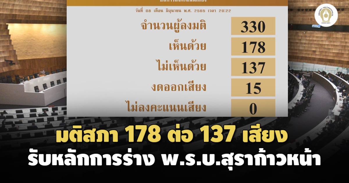 ต่อมาเมื่อเวลา 20.20 น. ที่ประชุมสภาผู้แทนราษฎร พิจารณาลงมติ ร่าง พ.ร.บ.ภาษีสรรพสามิต (ฉบับที่ ...) พ.ศ.... หรือที่รู้จักกันในชื่อ ร่าง พ.ร.บ.สุราก้าวหน้า โดยที่ประชุมมีมติ 178 ต่อ 137 เสียง งดออกเสียง 15 เสียง รับหลักการในวาระที่ 1