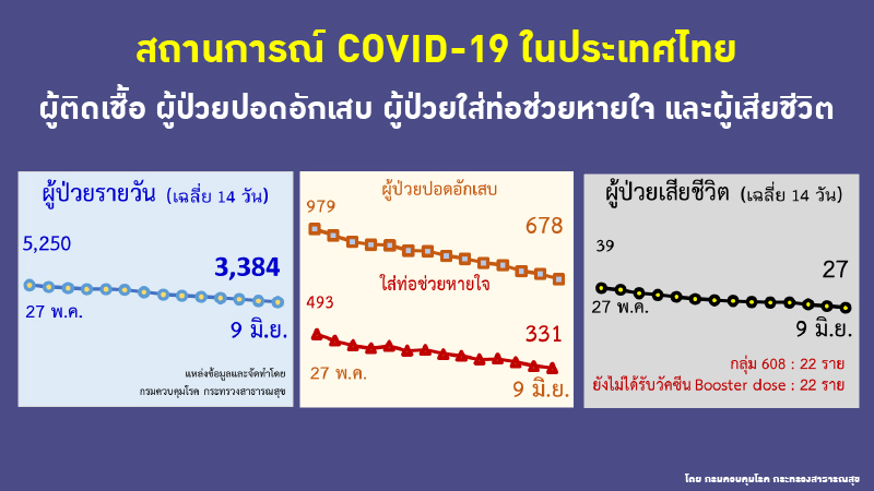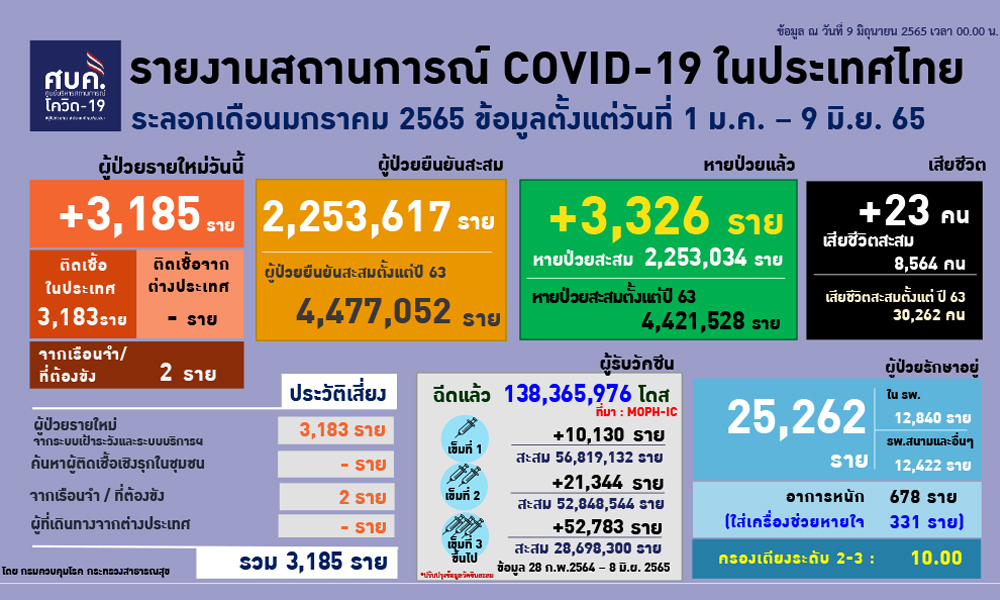 สำนักข่าวอิศรา (www.isranews.org) รายงานสถานการณ์การแพร่ระบาดเชื้อไวรัสโควิด -19 ประเทศไทย ประจำวันที่ 9 มิ.ย.2565 ว่า มีผู้ติดเชื้อใหม่ จำนวน 3,185 ราย เป็นผู้ติดเชื้อในประเทศทั้ง 3,185 ราย