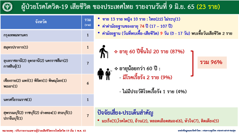 ด้านผู้เสียชีวิต 23 ราย มาจาก กทม. 1 ราย ปริมณฑล 1 ราย ภาคตะวันออกเฉียงเหนือ 7 ราย ภาคเหนือ 6 ราย ภาคใต้ 1 ราย และภาคกลาง 7 ราย เป็นกลุ่ม 608 คิดเป็น 96% จำแนกเป็น ผู้มีอายุมากกว่า 60 ปี 20 ราย คิดเป็น 87% ป่วยเรื้อรัง 2 ราย คิดเป็น 9% และไม่มีประวัติโรคเรื้อรัง 1 ราย คิดเป็น 4%