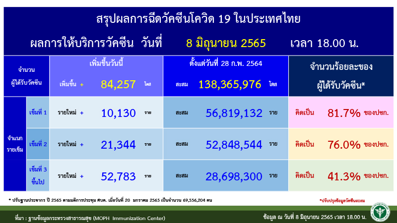 ขณะที่ การกระจายวัคซีนในประเทศ พบผู้ที่ได้รับผู้ที่ได้รับวัคซีนเข็มที่ 1 เพิ่มเติม จำนวน 10,130 ราย ผู้ได้รับเข็มที่ 2 จำนวน 21,344 ราย และผู้ได้รับเข็มที่ 3 จำนวน 52,783 ราย รวมสะสมผู้ได้รับวัคซีนแล้ว 138,365,976 ราย แบ่งเป็น ผู้ได้รับเข็มที่ 1 จำนวน 56,819,132 ราย คิดเป็น 81.7% ผู้ได้รับเข็มที่ 2 จำนวน 52,848,544 ราย คิดเป็น 76.0% และผู้ได้รับเข็มที่ 3 จำนวน 28,698,300 ราย คิดเป็น 41.3%