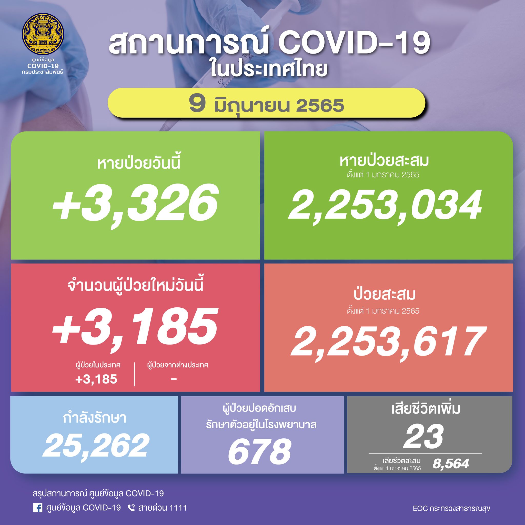 หายป่วยเพิ่ม 3,326 ราย อยู่ระหว่างรักษาตัว 25,262 ราย โดยในจำนวนนี้มีอาการหนัก 678 ราย และใส่ท่อช่วยหายใจ 331 ราย เสียชีวิตเพิ่ม 23 ราย รวมเสียชีวิตสะสม 30,262 ราย