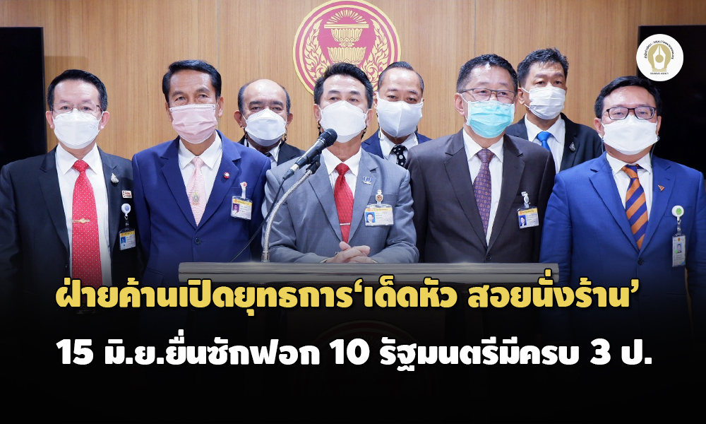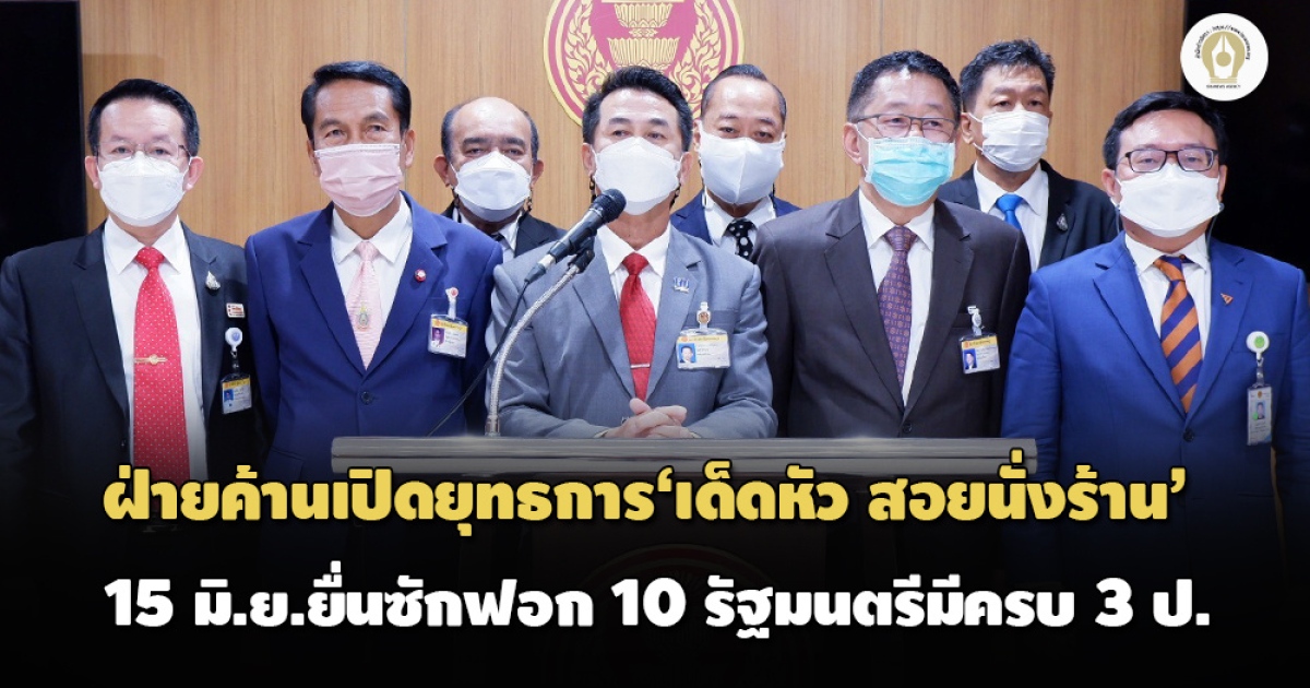 มติพรรคร่วมฝ่ายค้านเปิดยุทธการ ‘เด็ดหัว สอยนั่งร้าน’ ยื่นอภิปรายไม่ไว้วางใจ 10 รัฐมนตรี มีครบ 3 ป. ‘ประยุทธ์ – ประวิตร - อนุพงษ์’ คาดใช้เวลามากกว่า 4 วัน เตรียมยื่นญัตติ 15 มิ.ย.เวลา 10.00 น.