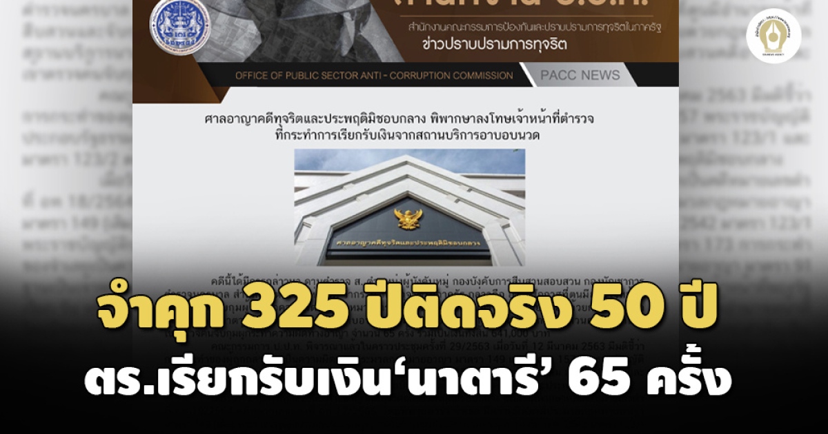 ป.ป.ท.เผยแพร่คำพิพากษาศาลอาญาทุจริตและประพฤติมิชอบกลาง พิพากษาจำคุก 325 ปี แต่ให้จำคุกจริง 50 ปี กรณีดาบตำรวจ เรียกรับเงินอาบอบนวด ‘นาตารี’ รวม 65 ครั้ง เป็นเงิน 6.51 แสนบาท โดย อัยการ-ป.ป.ท.ไม่อุทธรณ์คดีต่อ