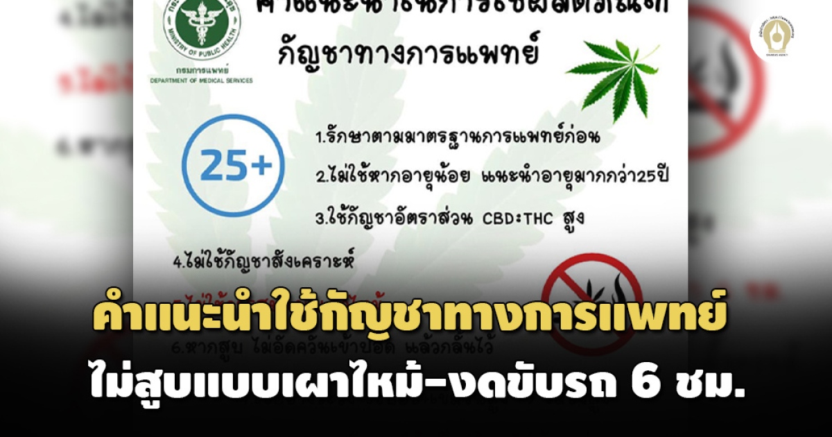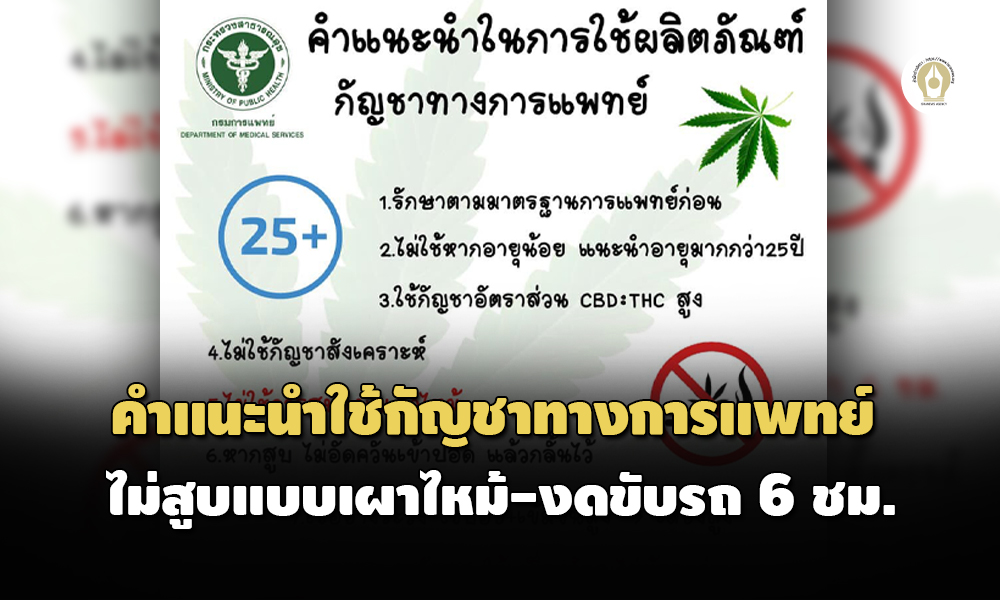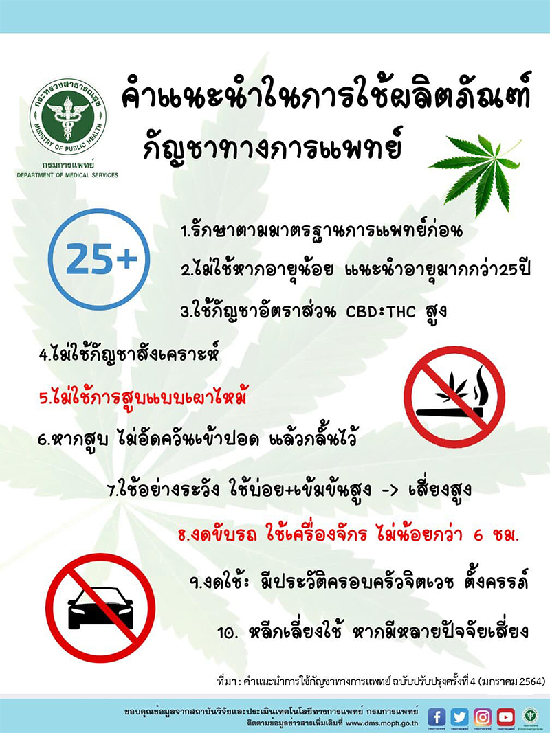 กรมการแพทย์ เผยแพร่ 10 คำแนะนำการใช้ผลิตภัณฑ์กัญชาทางการแพทย์ ไม่ใช้การสูบแบบเผาไหม้ งดขับรถไม่น้อยกว่า 6 ชั่วโมง ขณะที่ อย.อัปเดตคนใช้งานเว็บไซต์-แอปพลิเคชั่น 'ปลูกกัญ' 32 ล้านครั้ง ออกใบจดแจ้งกัญชา 5.95 แสนใบ กัญชง 1.89 หมื่นใบ