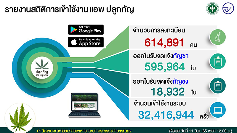 ล่าสุด เมื่อวันที่ 11 มิ.ย.เวลา 12.00 น. มีผู้เข้าใช้งานระบบ 32,416,944 ครั้ง จำนวนการลงทะเบียน 614,891 คน ออกใบรับจดแจ้งกัญชา 595,964 ใบ และออกใบรับจดแจ้งกัญชง 18,932 ใบ