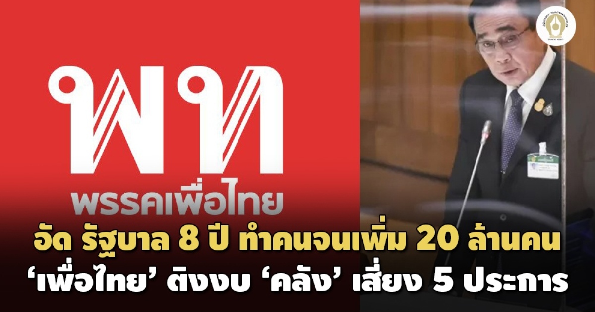 'เพื่อไทย' อัด 8 ปี รัฐบาลประยุทธ์ คนไทยจนเพิ่ม แห่ทำบัตรคนจนแล้ว 20 ล้านราย แนะ 2 ทางแก้วิกฤติเกษตร-ปากท้อง พร้อมแสดงความกังวลการทำงบกระทรวงการคลัง มีความเสี่ยงสูง 5 ประการ