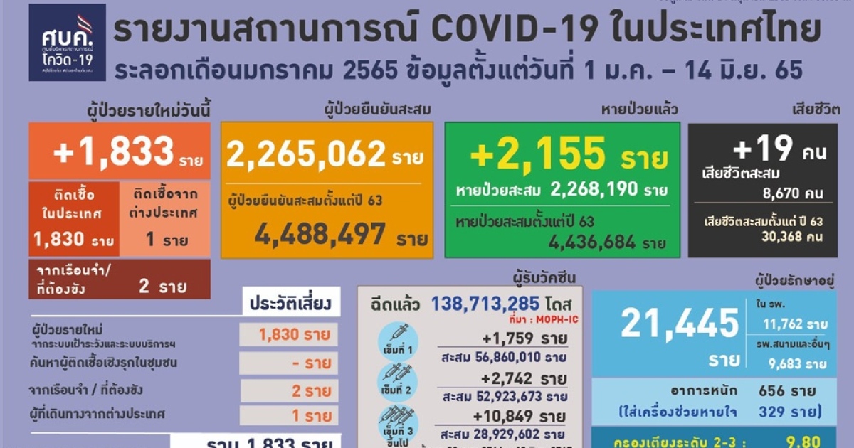 สำนักข่าวอิศรา (www.isranews.org) รายงานว่า เมื่อวันที่ 14 มิ.ย. 2565 ศูนย์บริหารสถาการณ์โควิด-19 (ศบค.) รายงานสถานการณ์ประจำวัน โดยพบผู้ป่วยรายใหม่ 1,833 ราย จำแนกเป็น ติดเชื้อในประเทศ 1,832 ราย เกิดจากระบบเฝ้าระวังและระบบบริการฯ 1,830 ราย ไม่พบการติดเชื้อจากการค้นหาเชิงรุกและในชุมชน ติดเชื้อภายในเรือนจำ 2 ราย อีก 1 ราย เป็นผู้ติดเชื้อเดินทางมาจากต่างประเทศ รวมผู้ป่วยสะสม 4,488,497 ราย