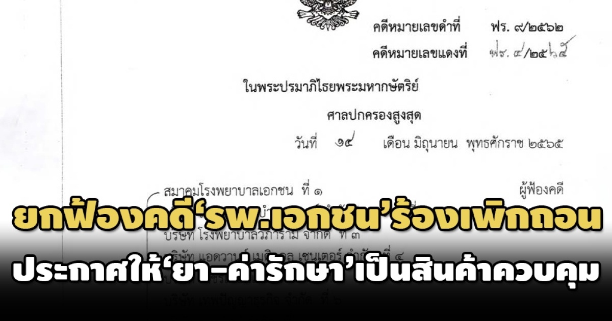 สำนักข่าวอิศรา (www.isranews.org) รายงานว่า เมื่อวันที่ 14 มิ.ย. ศาลปกครองสูงสุดพิพากษายกฟ้อง ในคดีที่สมาคมโรงพยาบาลเอกชน และโรงพยาบาลเอกชน รวม 42 คน ยื่นฟ้องขอเพิกถอนประกาศคณะกรรมการกลางว่าด้วยราคาสินค้าและบริการ (กกร.) ที่กำหนดให้ยารักษาโรคและเวชภัณฑ์เกี่ยวกับการรักษาโรคเป็นสินค้าควบคุม และกำหนดให้บริการรักษาพยาบาล บริการทางการแพทย์และบริการอื่นของสถานพยาบาลเกี่ยวกับการรักษาโรคเป็นบริการควบคุม