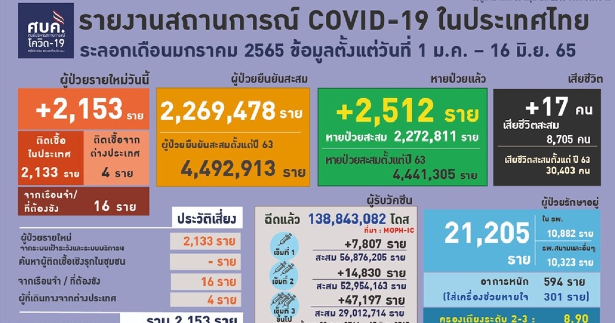 สำนักข่าวอิศรา (www.isranews.org) รายงานว่า เมื่อวันที่ 16 มิ.ย. 2565 ศูนย์บริหารสถาการณ์โควิด-19 (ศบค.) รายงานสถานการณ์ประจำวัน โดยพบผู้ป่วยรายใหม่ 2,153 ราย จำแนกเป็น ติดเชื้อในประเทศ 2,133 ราย เกิดจากระบบเฝ้าระวังและระบบบริการฯ 2,133 ราย ไม่พบการติดเชื้อจากการค้นหาเชิงรุกและในชุมชน ติดเชื้อภายในเรือนจำ 16 ราย อีก 4 ราย เป็นผู้ติดเชื้อเดินทางมาจากต่างประเทศ รวมผู้ป่วยสะสม 4,492,913 ราย
