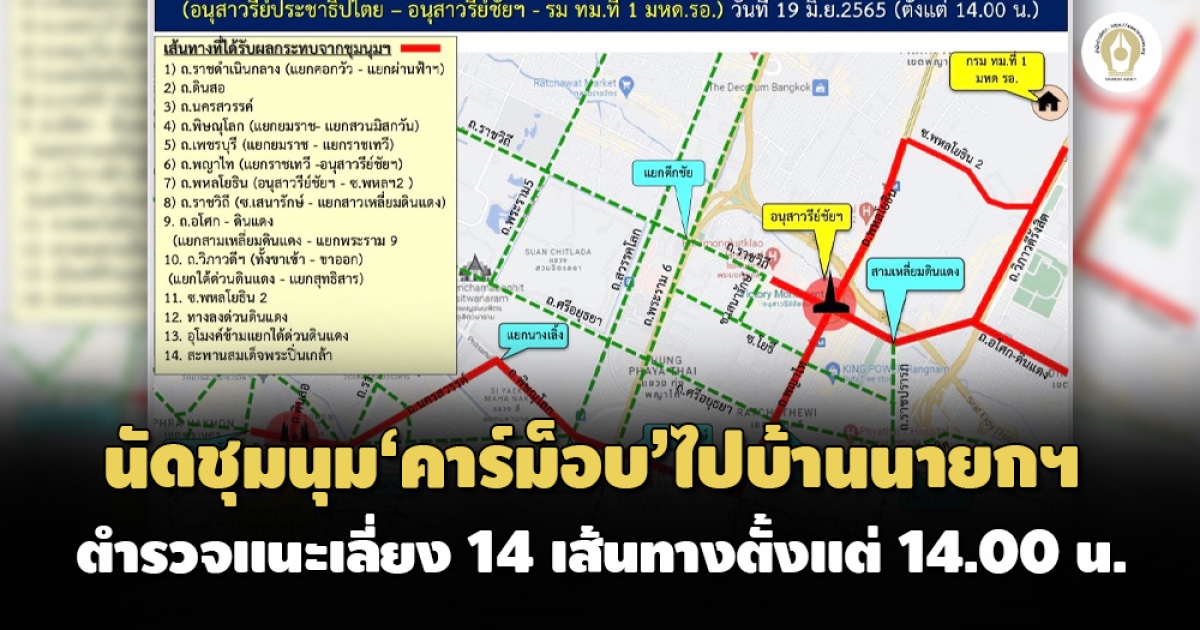 ‘คาร์ม็อบ’ นัดชุมนุม #ม็อบ19มิถุนา65 เคลื่อนขบวนจากอนุสาวรีย์ประชาธิปไตย ไปบ้านพัก ‘บิ๊กตู่’ ที่ ร.1 ทม.รอ. ด้านตำรวจแจ้งเตือนประชาชนหลีกเลี่ยง 14 เส้นทางตั้งแต่ 14.00 น.