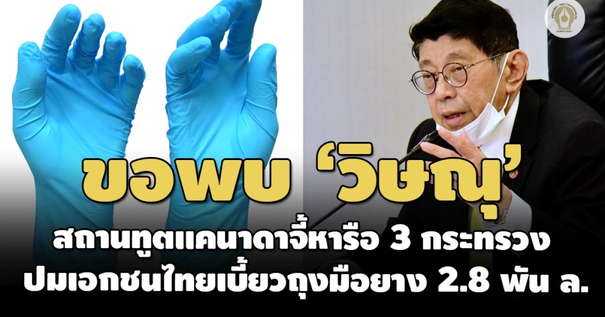 'สถานทูตแคนาดา' ทำหนังสือขอพบ 'วิษณุ เครืองาม' จี้หารือตัวแทนจากกระทรวงต่างประเทศ,กระทรวงพาณิชย์,กระทรวงยุติธรรม หลังพบเอกชนไทยหลายแห่งทำสัญญาถุงมือยางกับบริษัทต่างชาติกว่า 2.6 หมื่นล้านบาท รับเงินแล้ว 2.8 พันล้าน แต่ส่งของจริงแค่ 17 ล้านบาท-เจ้าตัวแจงส่งเรื่องไปสำนักปลัดฯ เพราะมี กก.รับผิดชอบ แต่ว่ายุบ กก.ไปแล้ว