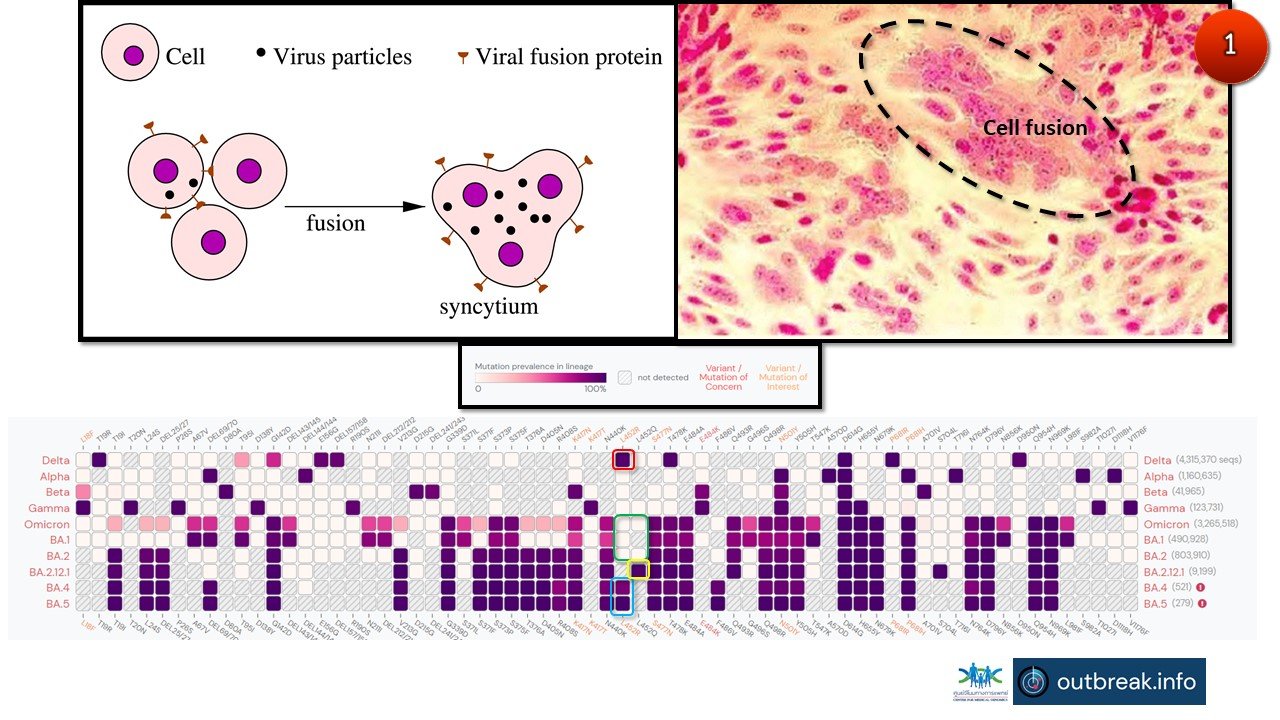 ส่วนหนามของโอไมครอนสายพันธุ์ย่อย BA.4, BA.5 และ BA.2.12.1 ที่เปลี่ยนแปลงไปสามารถเป็นตัวเชื่อมให้ผนังของหลายเซลล์หลอมรวมเป็นเซลล์เดียว (cell fusion หรือ syncytia formation) ดึงดูดให้ระบบภูมิคุ้มกันของผู้ติดเชื้อเข้ามาทำลายเกิดการอักเสบ (ของปอด) ซึ่งก่อให้เกิดอันตรายต่อชีวิตได้ (life-threating) (ภาพ 1)