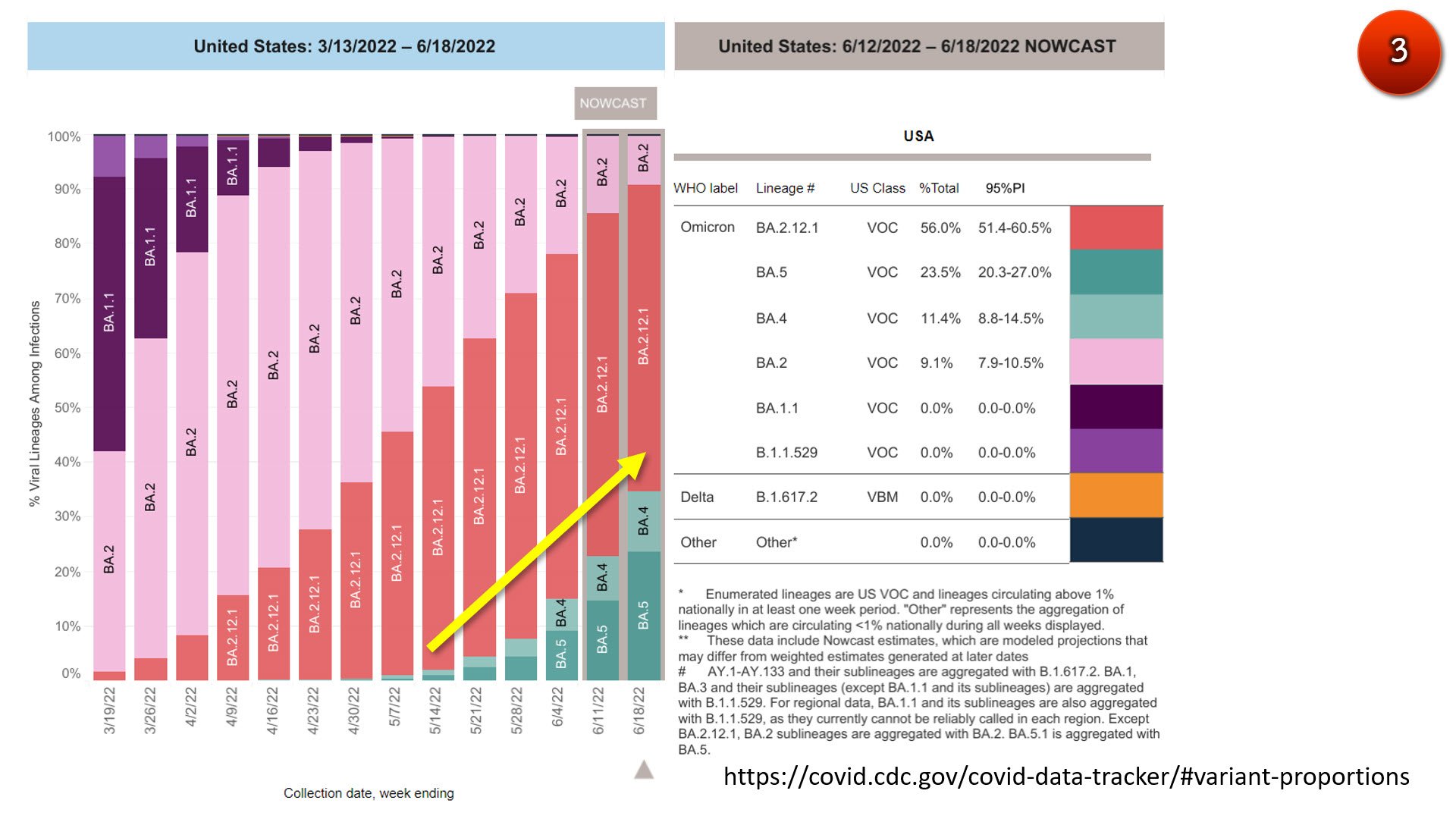ในทวีปอเมริกาเหนือ สายพันธุ์ย่อย BA.4 และ BA.5 ดูเหมือนจะแพร่ระบาดได้ดีกว่า BA.2.12.1 และมีความเป็นไปได้สูงที่จะระบาดเข้าไปแทนที่ BA.2.12.1 ที่กำลังระบาดใหญ่ในสหรัฐอเมริกา (ภาพ 3)