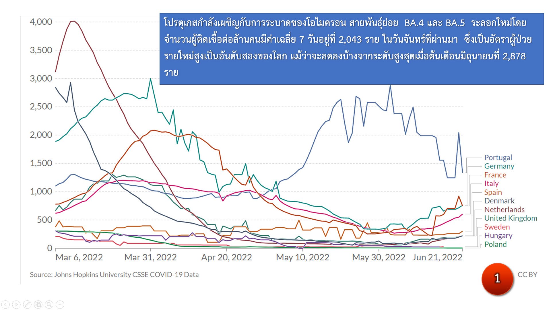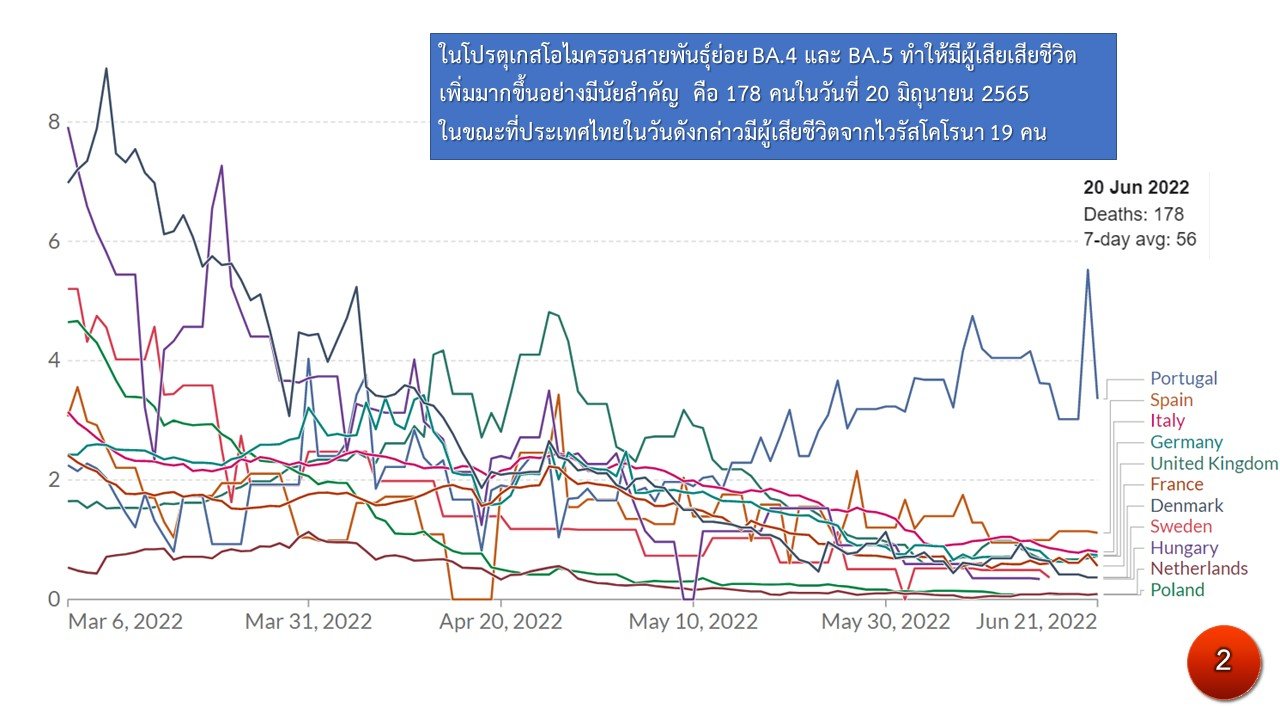 ตอบคือ โปรตุเกสกำลังเผชิญกับระบาดของโอมิครอน สายพันธุ์ย่อย BA.4 และ BA.5 ระลอกใหม่ โดยจำนวนผู้ติดเชื้อต่อล้านคนมีค่าเฉลี่ย 7 วัน อยู่ที่ 2,043 ราย ในวันจันทร์ (20 มิ.ย.65) ที่ผ่านมา ซึ่งเป็นอัตราผู้ป่วยรายใหม่สูงเป็นอันดับ 2 ของโลก แม้ว่าจะลดลงบ้างจากระดับสูงสุดเมื่อต้นเดือนมิ.ย.ที่ 2,878 ราย โดยมีผู้เสียชีวิตเพิ่มมากขึ้นอย่างมีนัยสำคัญ คือ 178 คน ในวันที่ 20 มิ.ย.65