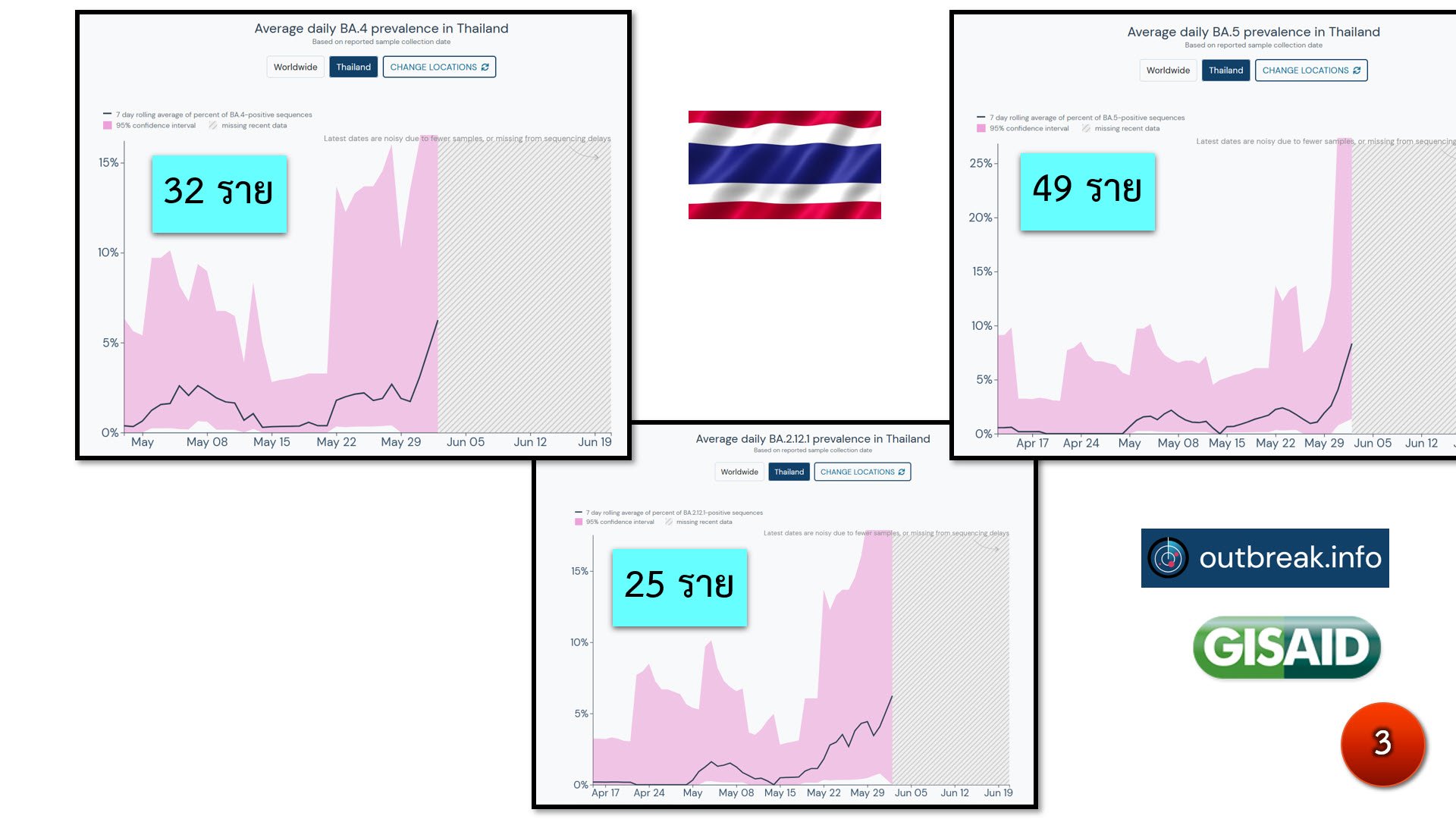 ปัจจุบัน (23 มิถุนายน 2565) มีจำนวน 32, 49, 25 ตามลำดับ ทั้งนี้ เฉพาะผู้ติดเชื้อสายพันธุ์ย่อย BA.4-BA.5 มีจำนวน 81 ราย และเมื่อรวมสายพันธุ์ BA.2.12.1 เข้าไปด้วยรวม 106 ราย