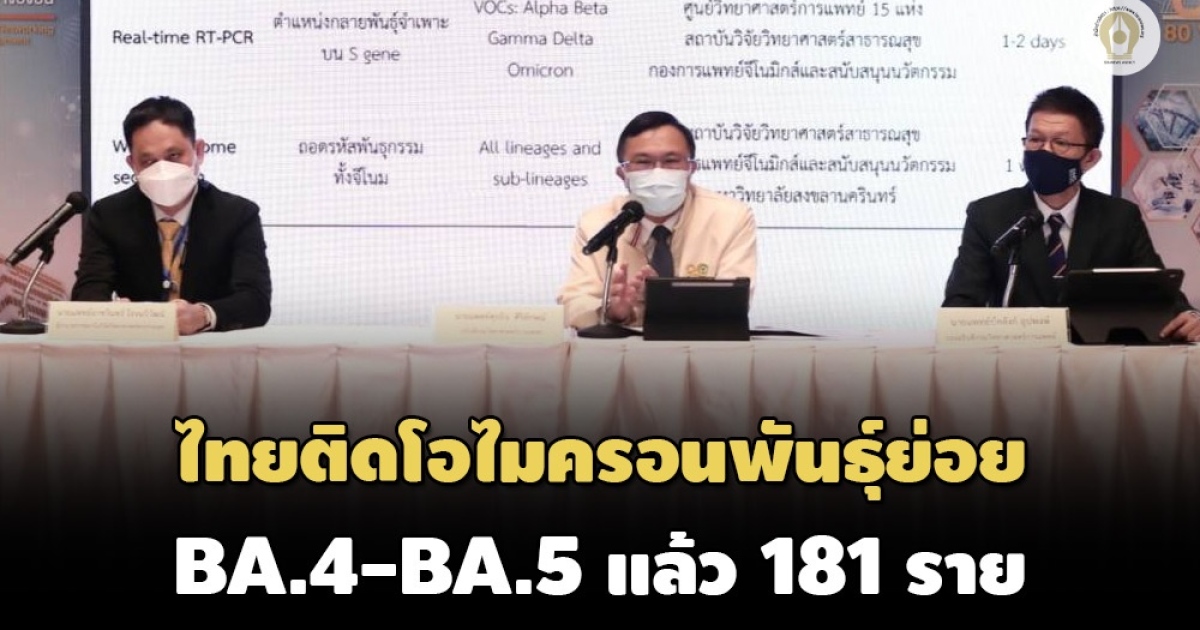 สธ.เผย BA.4-BA.5 ครองพื้นที่ระบาดในไทยกว่า 45% แพร่เร็วขึ้น 1.5 เท่า-หลบภูมิมากขึ้น มีผู้ป่วยยืนยันรวมแล้ว 181 ราย แบ่งเป็นติดเชื้อในประเทศ 133 อีก 48 รายมาจากต่างประเทศ ส่วนใหญ่พบใน กทม. ชี้เคยติดโอไมครอนอื่นแล้ว ก็ติดซ้ำได้