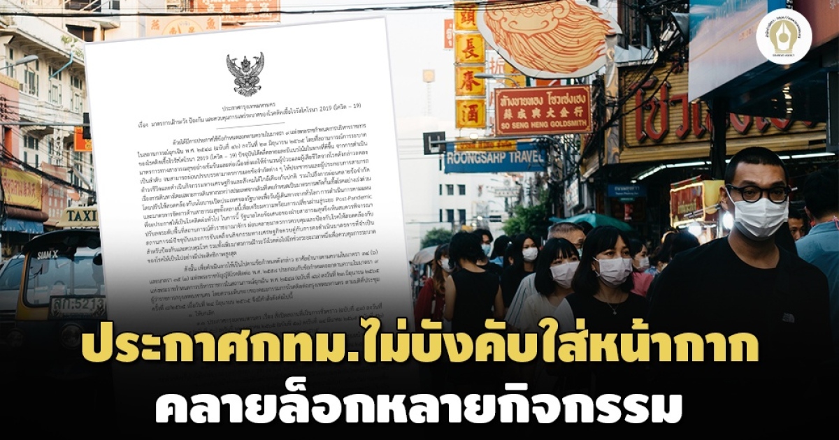 ‘ชัชชาติ’ เซ็นประกาศ กทม. คลายล็อกมาตรการโควิด ไม่บังคับใส่หน้ากากอนามัยเว้นอยู่ที่มีคนจำนวนมาก กิจการต่างๆ เช่น ร้านเสริมสวย, สปา, ร้านนวด, สถานบันเทิง, ผับบาร์, เปิดให้บริการได้แล้ว