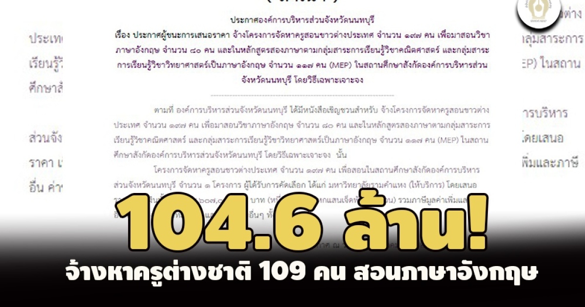 คุ้ยข้อมูลจัดซื้อจ้างหน่วยงานรัฐ พบ อบจ.นนท์ ควักเงิน 104.6 ล้าน เจาะจงจ้าง ม.รามคำแหง จัดหาครูต่างชาติ 197 คน สอนภาษาอังกฤษ รวมหลักสูตร 2 ภาษา วิชาวิทย์ -คณิตศาสตร์ ให้สถานศึกษาในสังกัด เผยใช้วิธีเจาะจง ขึ้นสถานะล่าสุด ส่งมอบงานช้ากว่ากำหนด