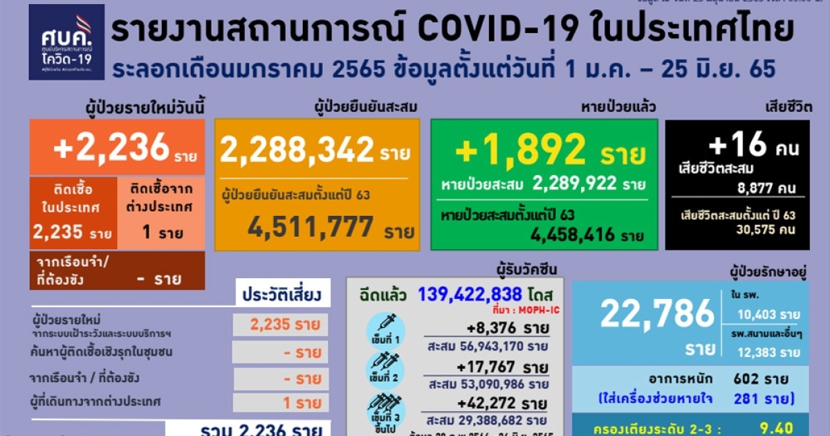 สำนักข่าวอิศรา (www.isranews.org) รายงานว่า เมื่อวันที่ 25 มิ.ย. 2565 ศูนย์บริหารสถาการณ์โควิด-19 (ศบค.) รายงานสถานการณ์ประจำวัน โดยพบผู้ป่วยรายใหม่ 2,236 ราย จำแนกเป็น ติดเชื้อในประเทศ 2,235 ราย เกิดจากระบบเฝ้าระวังและระบบบริการฯ 2,313 ราย ไม่พบการติดเชื้อจากการค้นหาเชิงรุกและในชุมชน ไม่พบผู้ติดเชื้อภายในเรือนจำ อีก 1 ราย เป็นผู้ติดเชื้อเดินทางมาจากต่างประเทศ รวมผู้ป่วยสะสม 4,511,777 ราย
