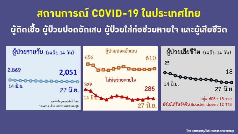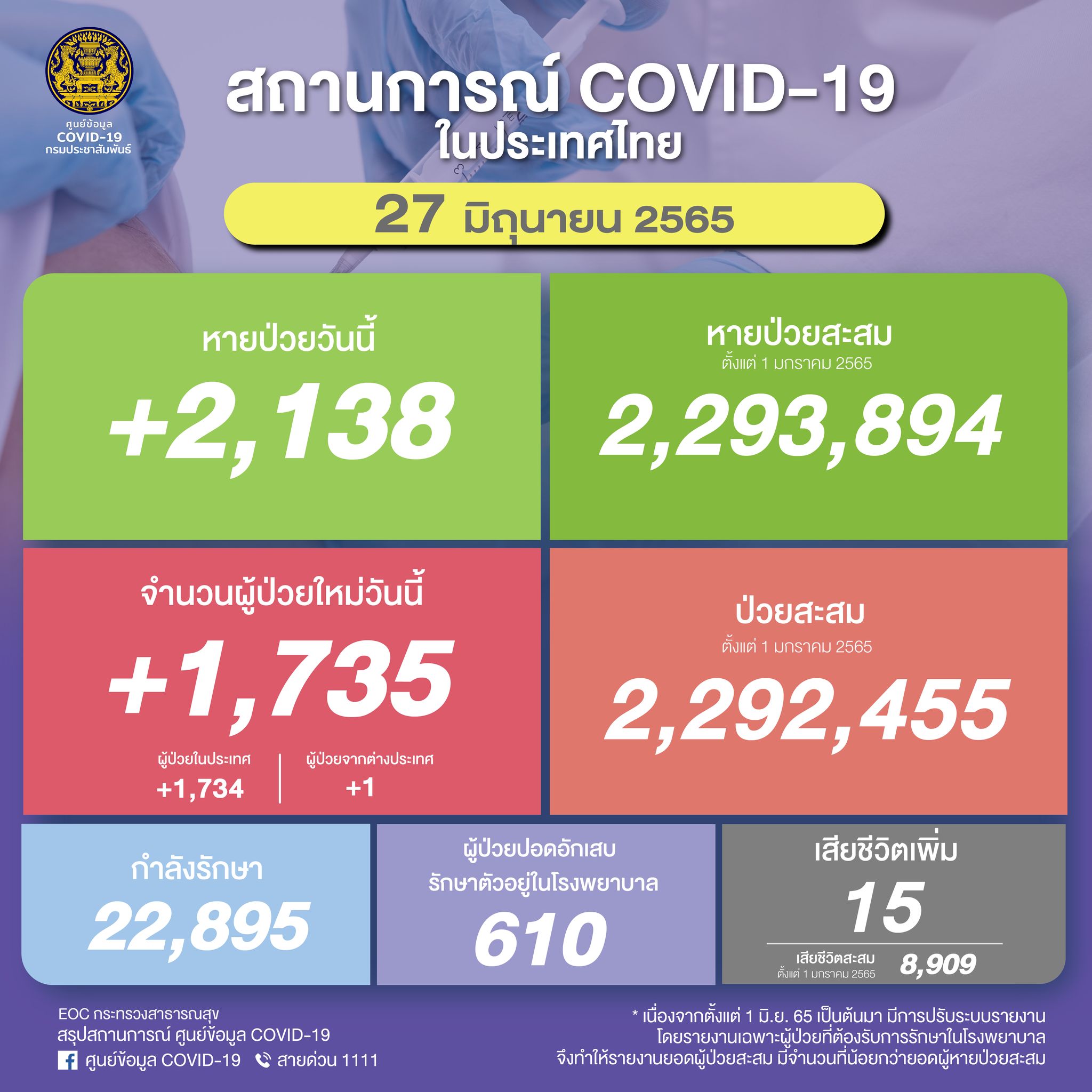 เมื่อเวลา 08.00 น.สำนักข่าวอิศรา (www.isranews.org) รายงานสถานการณ์แพร่ระบาดของโรคโควิด-19 ประเทศไทย ประจำวันที่ 27 มิ.ย. 65 ว่า มีจำนวนผู้ติดเชื้อใหม่ 1,735 ราย เป็นผู้ติดเชื้อในประเทศ 1,734 ราย มาจากต่างประเทศ 1 ราย