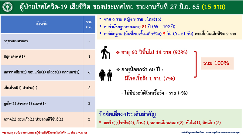 มีผู้เสียชีวิตใหม่อีก 15 ราย ยอดรวมเสียชีวิตสะสม (ตั้งแต่ 1 มกราคม 2565) 8,909 ราย