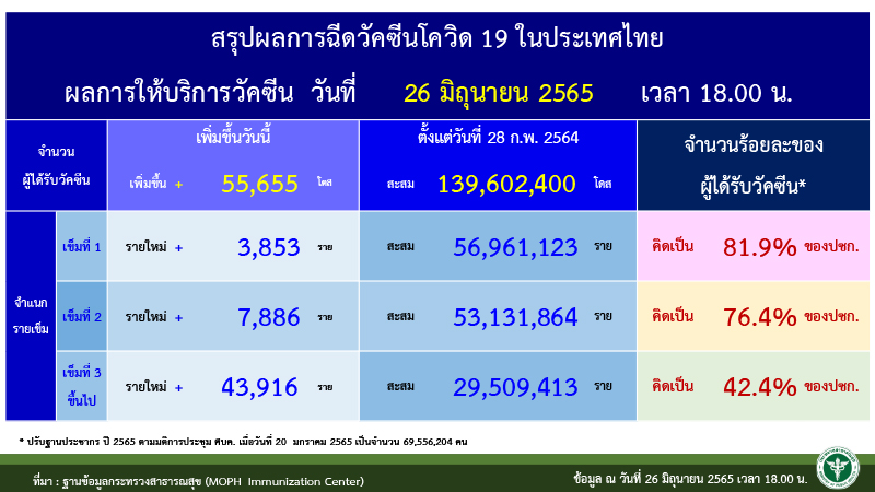 ขณะที่ การกระจายวัคซีนในประเทศ เมื่อวันที่ พบผู้ที่ได้รับผู้ที่ได้รับวัคซีนเข็มที่ 1 เพิ่มเติม จำนวน 3,853 ราย ผู้ได้รับเข็มที่ 2 จำนวน 7,886 ราย และผู้ได้รับเข็มที่ 3 จำนวน 43,916 ราย รวมสะสมผู้ได้รับวัคซีนแล้ว 139,602,400 ราย แบ่งเป็น ผู้ได้รับเข็มที่ 1 จำนวน 56,961,123 ราย คิดเป็น 81.9% ผู้ได้รับเข็มที่ 2 จำนวน 53,131,864 ราย คิดเป็น 76.4% และผู้ได้รับเข็มที่ 3 จำนวน 29,509,413 ราย คิดเป็น 42.4%