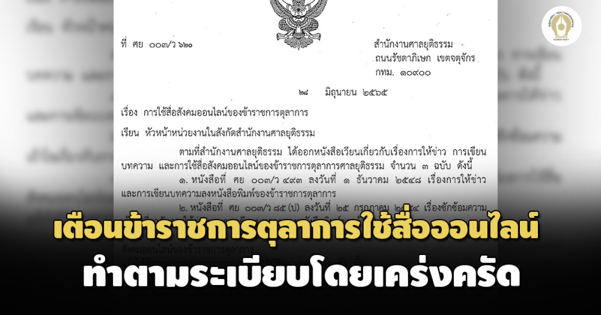 เลขาฯศาลยุติธรรม ทำหนังสือแจ้งข้าราชการตุลาการ ย้ำใช้สื่อออนไลน์ตามระเบียบว่าด้วยการให้ข่าวโดยเคร่งครัด หลังปรากฏว่ามีการแสดงความเห็น-เผยแพร่ข้อมูล อาจทำให้กระทบกระเทือนต่อเกียรติศักดิ์แห่งหน้าที่ราชการและภาพลักษณ์ศาล