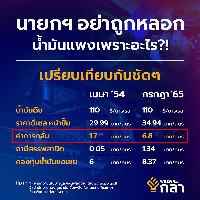 ผู้สื่อข่าวรายงานว่า เมื่อวันที่ 3 ก.ค.2565 นายกรณ์ จาติกวณิช หัวหน้าพรรคกล้า และอดีต รมว.คลัง โพสต์ข้อความผ่านเฟซบุ๊ก กรณ์ จาติกวณิช - Korn Chatikavanij ระบุว่า ในวันที่ 4 ก.ค. พล.อ.ประยุทธ์ จันทร์โอชา นายกรัฐมนตรี และ รมว.กลาโหม จะนัดประชุมสภาความมั่นคงแห่งชาติเพื่อพิจารณาวิธีแก้ปัญหาราคาน้ำมันแพง ดังนั้นจึงอยากให้ท่านได้เห็นข้อมูลที่เข้าใจง่ายมากขึ้น จึงขอยกสมัยที่ตนอยู่ในรัฐบาลนายอภิสิทธิ์ เวชชาชีวะ เป็นนายกรัฐมนตรี ราคาน้ำมันดิบอยู่ในระดับเดียวกันกับวันนี้ที่ราคา 110 ดอลลาร์ต่อบาร์เรลเท่ากัน แต่ราคาดีเซลหน้าปั๊มถูกกว่ากันถึง 5 บาทต่อลิตร