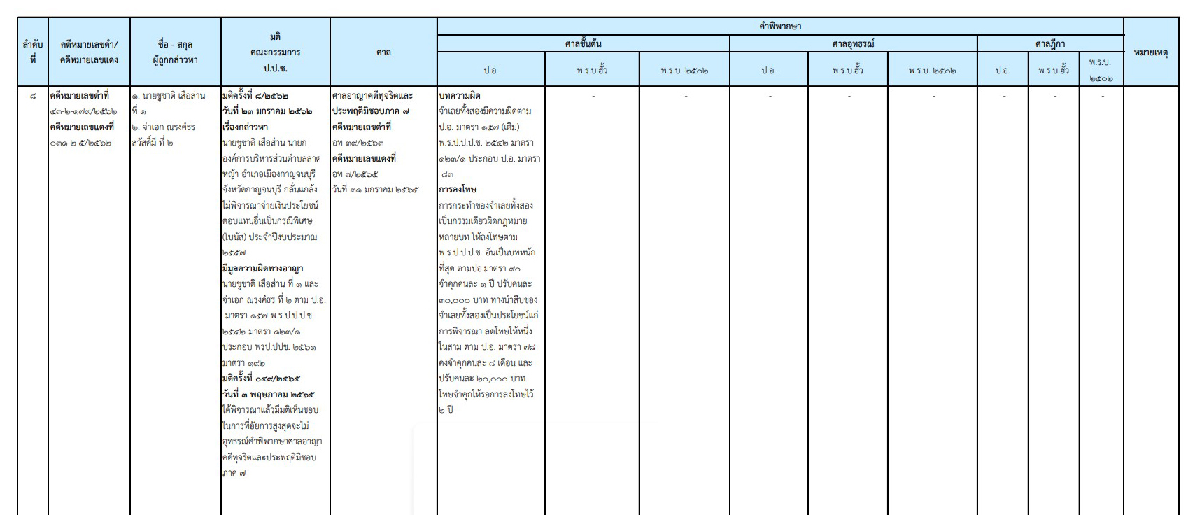 ป.ป.ช.เผยแพร่ความคืบหน้าคดีกล่าวหา 'ชูชาติ เสือส่าน' อดีตนายก อบต.ลาดหญ้า อำเภอเมืองกาญจนบุรี -พวก กลั่นแกล้งไม่พิจารณาจ่ายเงินโบนัสลูกน้อง ปี 53 ล่าสุด ศาลอาญาคดีทุจริตประพฤติมิชอบ ภาค 7 พิพากษาลงโทษคงจำคุกคนละ 8 เดือน ปรับ 20,000 บาท แต่รอลงอาญา 2 ปี