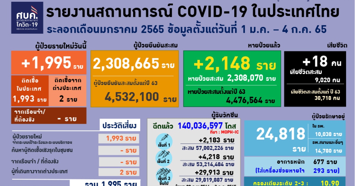 สำนักข่าวอิศรา (www.isranews.org) รายงานสถานการณ์แพร่ระบาดของโรคโควิด-19 ประเทศไทย ประจำวันที่ 4 ก.ค. 2565 ว่า มีจำนวนผู้ติดเชื้อใหม่ 1,995 ราย เป็นผู้ติดเชื้อในประเทศ 1,993 ราย มาจากต่างประเทศ 2 ราย