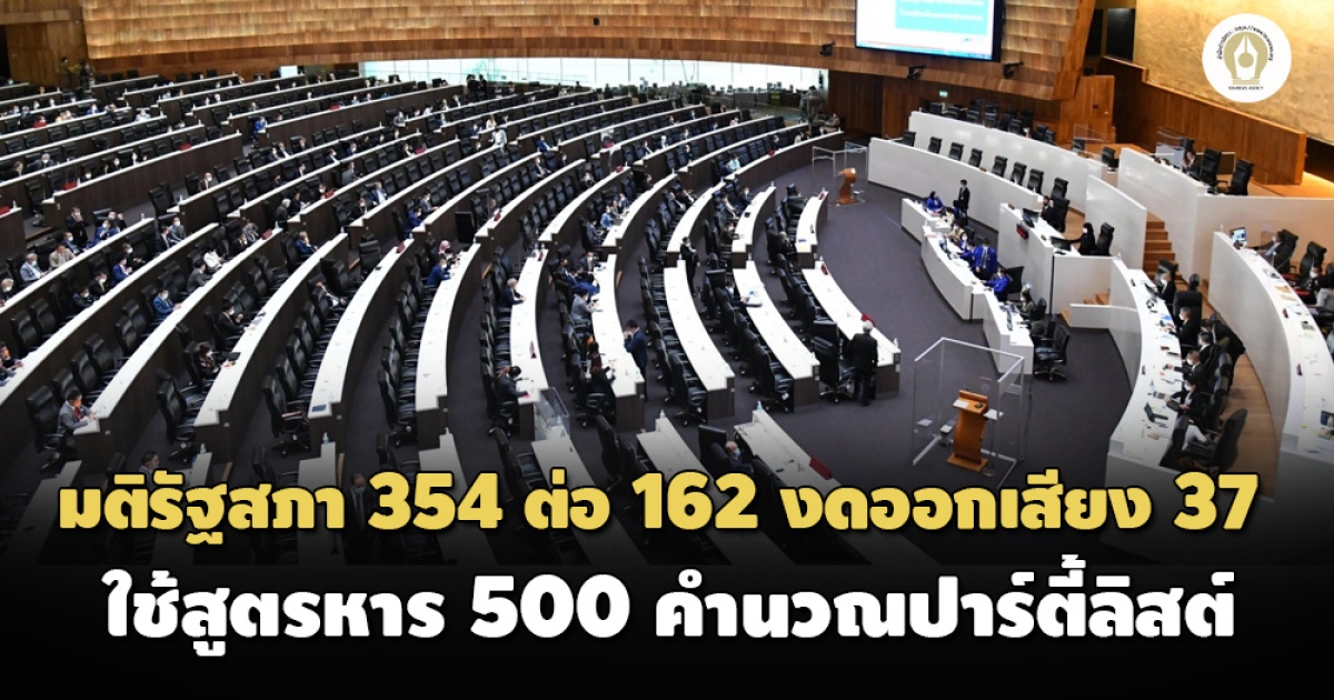 มติรัฐสภา 354 ต่อ 162 งดออกเสียง 37 เสียง ใช้สูตรหาร 500 คำนวณ ส.ส.ปาร์ตี้ลิสต์ ด้าน ‘หมอระวี’ เชื่อทำเท่าเทียมทุกพรรค ส่วนสกัดแลนด์สไลด์-พรรคเล็กไม่สูญพันธุ์เป็นแค่ผลพลอยได้ ขณะที่ ‘หมอชลน่าน’ ซัดสภาวิบัติ แทรกซ้อนหลักการทุกมาตรา แซะถ้าเอาหาร 500 ระวังถูกมองเป็นสภาเผด็จการถูกครอบงำโดยเผด็จการ