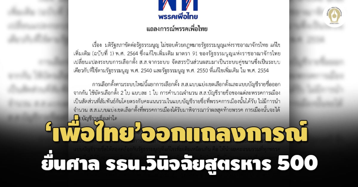 แถลงการณ์พรรคเพื่อไทยอัดรัฐสภาใช้เสียงข้างมากทำตามอำเภอ ฝ่าฝืนกฎหมายเพื่อสืบทอดอำนาจ เตรียมส่งศาลรัฐธรรมนูญวินิจฉัย ปมลงมติมาตรา 128 คำนวณปาร์ตี้ลิสต์ด้วยสูตรหาร 500