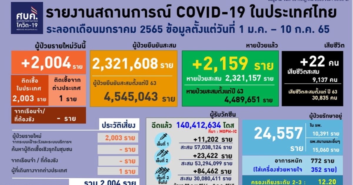 ไทยป่วยโควิดเพิ่ม 2,004 ราย อาการหนัก 772 ราย ขณะที่หายกลับบ้าน 2,159 ราย และเสียชีวิตเพิ่ม 22 ราย ทั้งหมดเป็นกลุ่ม 608-ยังไม่ได้รับวัคซีนเข็มกระตุ้นถึง 18 ราย