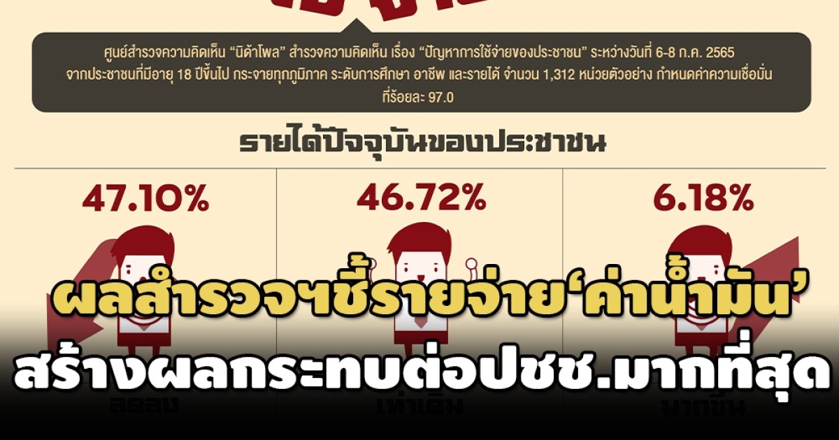 ‘นิด้าโพล’ เผยผลสำรวจ พบรายจ่าย ‘ค่าน้ำมัน’ สร้างผลกระทบต่อประชาชนมากที่สุด รองลงมาเป็น ‘ค่าอาหารประจำวัน’ ขณะที่กลุ่มตัวอย่าง 47.1% ระบุมีรายได้ลดลง