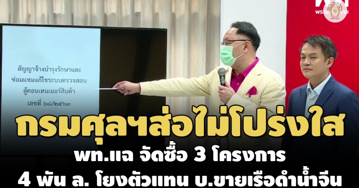 เพื่อไทยแถลง ทุจริตรัฐบาล พล.อ.ประยุทธ์ต้องรับผิดชอบ ชี้โครงการซ่อมกล้องวงจรปิด-ตรวจสอบตู้คอนเทนเนอร์กรมศุลกากร รวม 4 พันล้านส่อไม่โปร่งใส โยงเอกชนตัวแทน บ.ขายเรือดำน้ำจีน พบเป็นกลุ่มบริจาคเงินให้พรรคพลังประชารัฐด้วย คาดข้อมูลแน่นหน้าอภิปรายน็อค พล.อ.ประยุทธ์ได้แน่