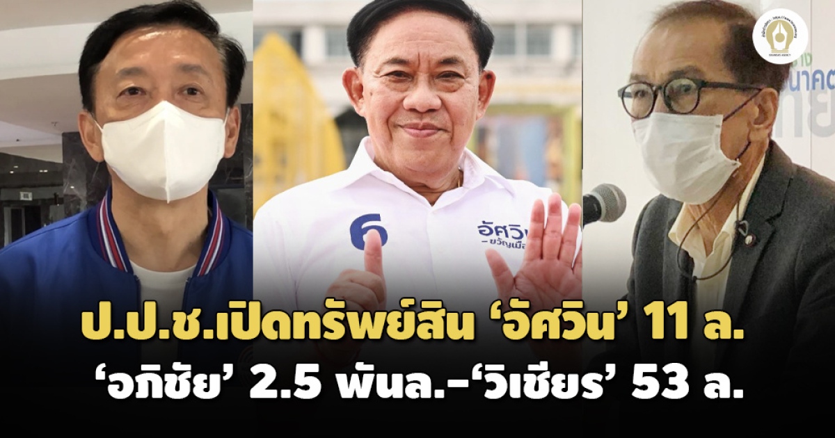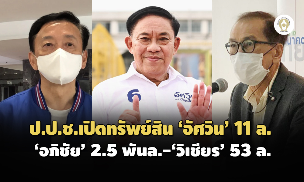 ป.ป.ช.เปิดบัญชทรัพย์สิน 3 บุคคลดัง ‘อัศวิน ขวัญเมือง’พ้นผู้ว่าฯ กทม. 11.51 ล้านบาท ไม่มีหนี้สิน ‘อภิชัย เตชะอุบล’พ้น ส.ส.ปชป. 2,582.48 ล้านบาท อีกคน ‘วิเชียร ชวลิต’พ้น ส.ส.พปชร. 53.24 ล้านบาท