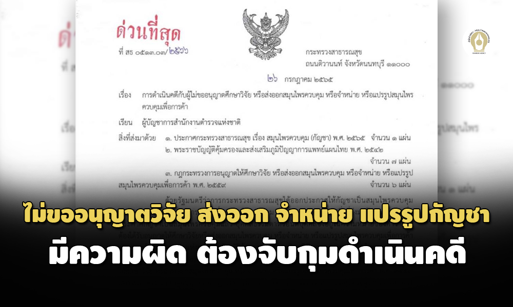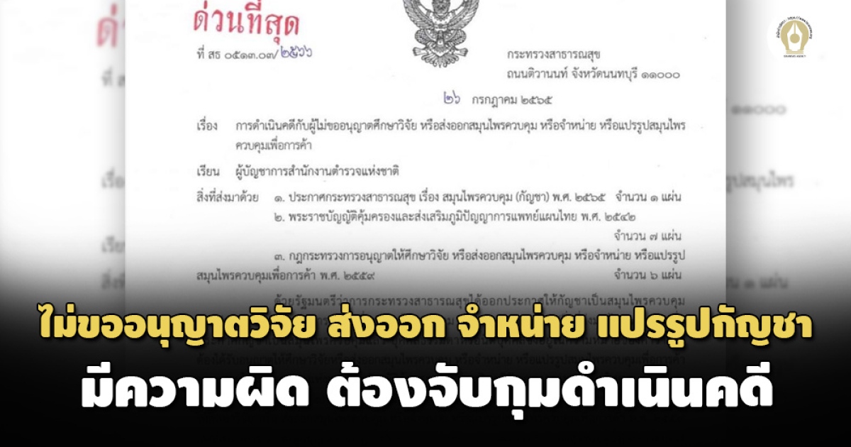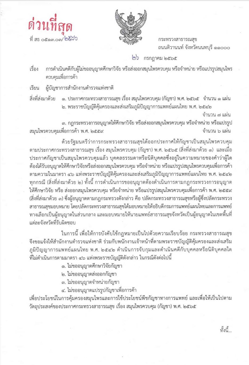 สธ.ทำหนังสือด่วนที่สุด ถึงผู้บัญชาการตำรวจแห่งชาติ ผู้ใดไม่ขออนุญาตศึกษา วิจัย ส่งออก จำหน่าย หรือแปรรูปกัญชาเพื่อการค้า มีความผิดต้องจับกุมดำเนินคดีตามกฎหมาย