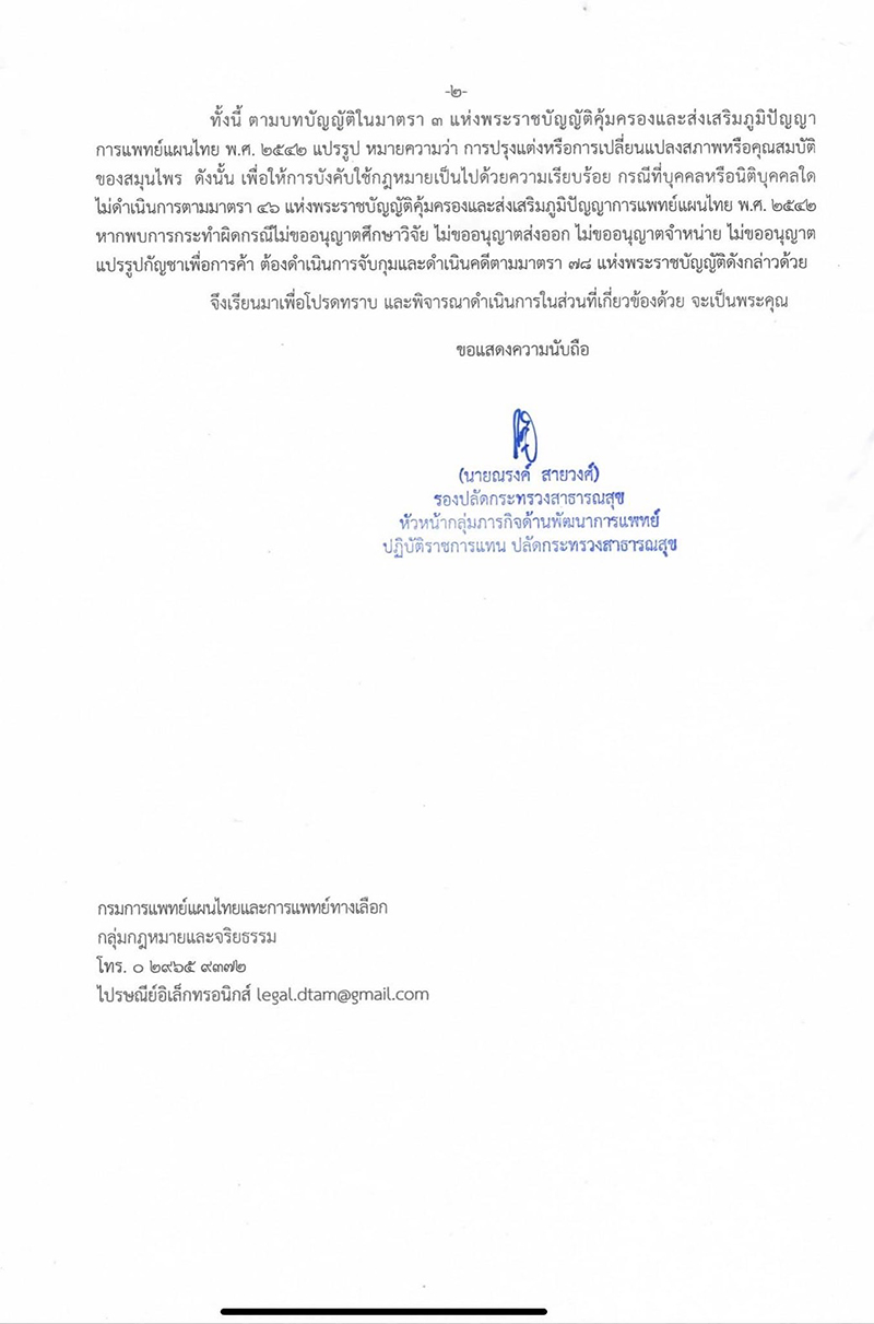 ในการนี้ เพื่อให้การบังคับใช้กฎมหายเป็นไปด้วยความเรียบร้อย กระทรวงสาธารณสุข ขอแจ้งให้สำนักงานตำรวจแห่งชาติ ร่วมกับพนักงานเจ้าหน้าที่ตาม พ.ร.บ.คุ้มครองและส่งเสริมภูมิปัญญาการแพทย์แผนไทย พ.ศ.2542 ดำเนินการจับกุมและดำเนินคดีกับบุคคลหรือนิติบุคคลใดที่ไม่ดำเนินการตามมาตรา 46 แห่ง พ.ร.บ.ดังกล่าว ในกรณี ดังต่อไปนี้