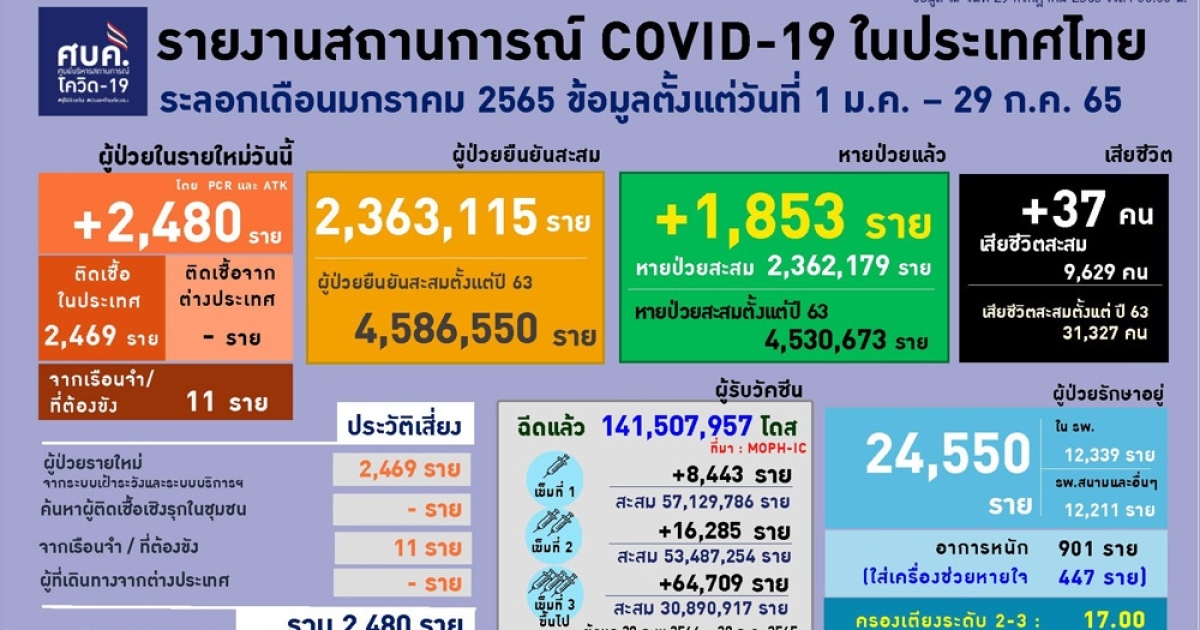 สำนักข่าวอิศรา (www.isranews.org) รายงานว่า เมื่อวันที่ 29 ก.ค. 2565 ศูนย์บริหารสถาการณ์โควิด-19 (ศบค.) รายงานสถานการณ์ประจำวัน โดยพบผู้ป่วยรายใหม่ 2,480 ราย จำแนกเป็น ติดเชื้อในประเทศ 2,469 ราย เกิดจากระบบเฝ้าระวังและระบบบริการฯ 1,875 ราย ติดเชื้อภายในเรือนจำ 11 ราย และไม่พบผู้ติดเชื้อเดินทางจากต่างประเทศ รวมผู้ป่วยสะสม 4,586,550 ราย