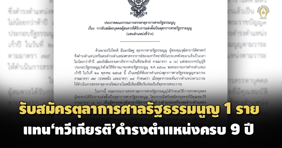 ผู้สื่อข่าวรายงานว่า เมื่อวันที่ 2 ส.ค.2565 น.ส.ปิยกุล บุญเพิ่ม ประธานศาลฎีกา ในฐานะประธานสรรหาตุลาการศาลรัฐธรรมนูญ ลงนามในประกาศคณะกรรมการสรรหาตุลาการศาลรัฐธรรมนูญ เรื่อง การรับสมัครผู้สมควรได้รับการแต่งตั้งเป็นตุลาการศาลรัฐธรรมนูญ แทนตำแหน่งที่ว่าง โดยระบุว่า ด้วยนายทวีเกียรติ มีนะกนิษฐ ตุลาการศาลรัฐธรรมนูญ ผู้ทรงคุณวุฒิสาขานิติศาสตร์ ดำรงตำแหน่งหรือเคยดำรงตำแหน่งศาสตราจารย์ของมหาวิทยาลัยในประเทศไทยมาแล้วเป็นเวลาไม่น้อยกว่า 5 ปี และยังมีผลงานทางวิชาการเป็นที่ประจักษ์ ตามมาตรา 8 (3) แห่ง พ.ร.ป.ว่าด้วยวิธีพิจารณาของศาลรัฐธรรมนูญ พ.ศ.2561 จะครบวาระดำรงตำแหน่ง 9 ปี ในวันที่ 21 ต.ค.2565 นี้ เป็นเหตุให้พ้นจากตำแหน่งตามวาระ มาตรา 79 วรรคหนึ่ง และมาตรา 19 กำหนดว่า เมื่อตุลาการพ้นจากตำแหน่งตามวาระให้ดำเนินการสรรหาตุลาการใหม่ภายใน 120 วันก่อนที่ตุลาการจะครบวาระ