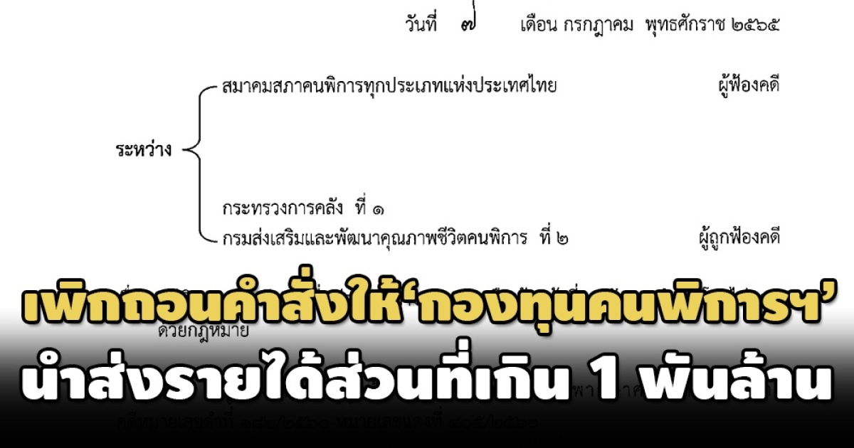 ‘ศาลปกครองสูงสุด’ พิพากษาเพิกถอนคำสั่ง ‘ก.คลัง’ ให้ ‘กองทุนคนพิการฯ’ นำส่งเงินเฉพาะส่วนที่เกินกว่า 1 พันล้าน เป็นรายได้แผ่นดิน ระบุเป็นการใช้ดุลพินิจโดยมิชอบ