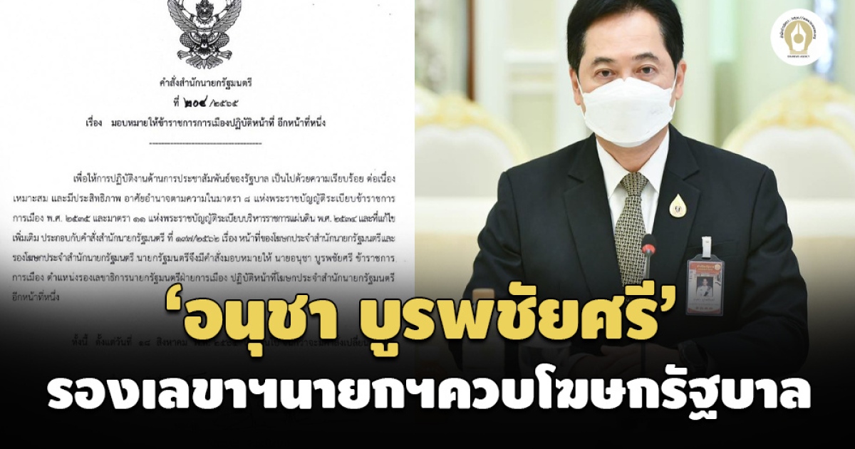 ผู้สื่อข่าวรายงานว่า เมื่อวันที่ 18 ส.ค.2565 พล.อ.ประยุทธ์ จันทร์โอชา นายกรัฐมนตรี และ รมว.กลาโหม ลงนามในคำสั่งสำนักนายกรัฐมนตรี ที่ 204/2565 เรื่องมอบหมายให้ข้าราชการการเมืองปฏิบัติหน้าที่ อีกหน้าที่หนึ่ง ระบุว่า เพื่อให้การประชาสัมพันธ์ของรัฐบาล เป็นไปด้วยความเรียบร้อย ต่อเนื่อง เหมาะสม และที่ประสิทธิภาพ นายกรัฐมนตรีจึงมีคำสั่งมอบหมายให้ นายอนุชา บูรพชัยศรี ข้าราชการการเมือง ตำแหน่งรองเลขาธิการนายกรัฐมนตรีฝ่ายการเมือง ปฏิบัติหน้าที่โฆษกประจำสำนักนายกรัฐมนตรี อีกหน้าที่หนึ่ง ตั้งแต่วันที่ 18 ส.ค.เป็นต้นไปจนกว่าจะมีคำสั่งเปลี่ยนแปลง