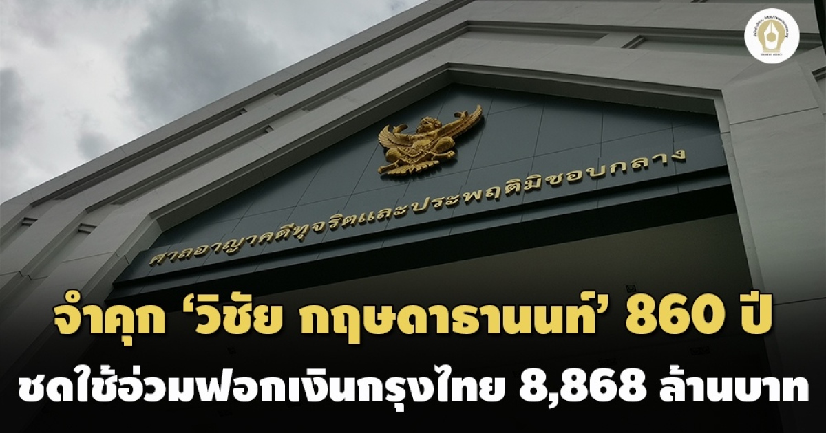 ศาลอาญาทุจริตพิพากษา ‘วิชัย กฤษดาธานนท์พร้อมพวกรวม 6 ราย’ ฐานรับเงินที่กู้จากธ.กรุงไทยไม่ชอบอ่วม สั่งจำคุกมากสุด 860 ปี ก่อนยึดประมวลกฎหมายอาญาเหลือคนละ 20 ปี ก่อนสั่งชดใช้เงินรวม 8,868 ล้าน