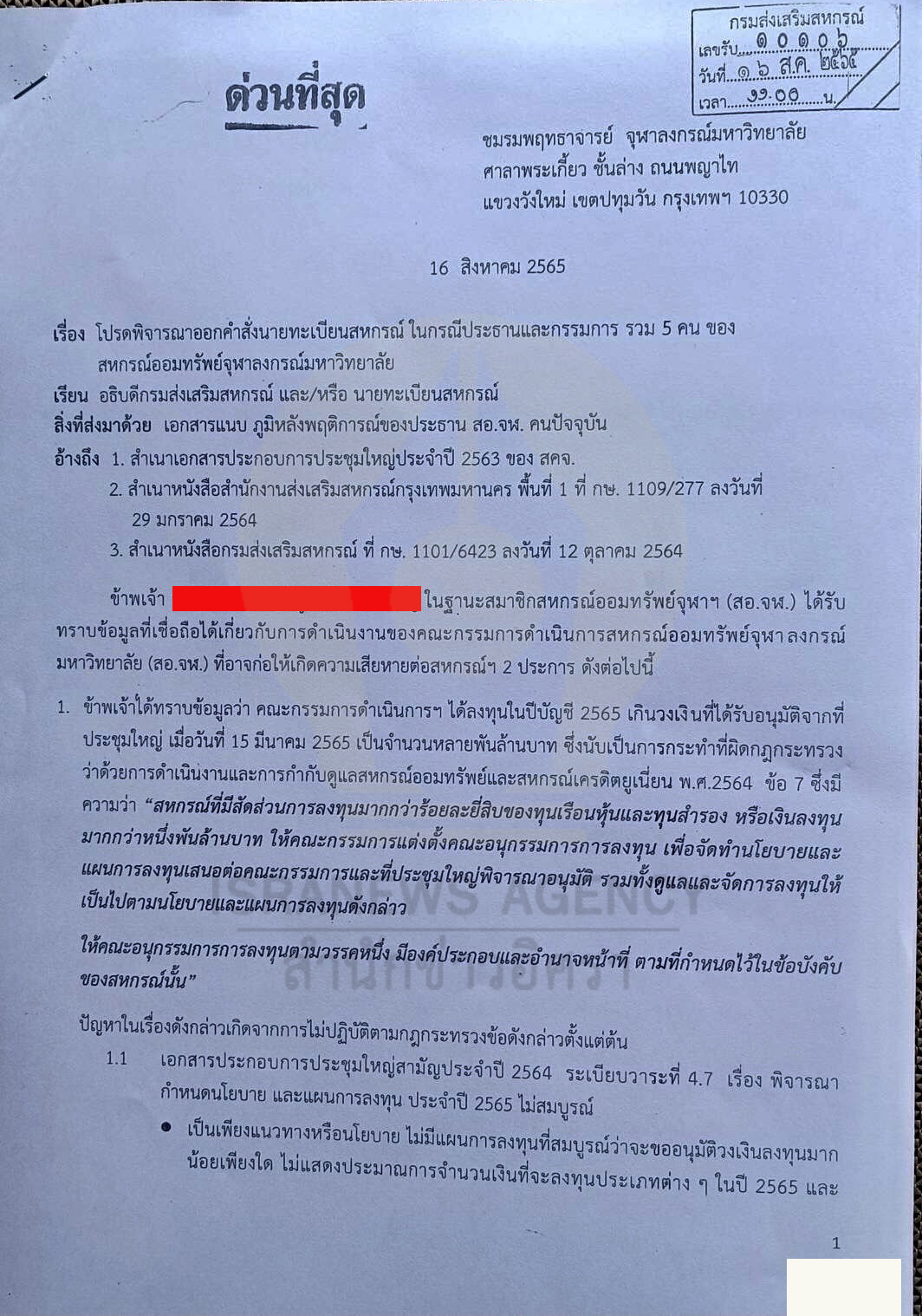 สำนักข่าวอิศรา (www.isranews.org) รายงานว่า เมื่อวันที่ 16 ส.ค.ที่ผ่านมา สมาชิกของสหกรณ์ออมทรัพย์จุฬาลงกรณ์มหาวิทยาลัย (สอ.จฬ.) จำนวนหนึ่ง เข้ายื่นหนังสือร้องเรียนถึงอธิบดีกรมส่งเสริมสหกรณ์ ในฐานะนายทะเบียนสหกรณ์ เพื่อขอให้นายทะเบียนสหกรณ์พิจารณาใช้อำนาจสั่งการลงโทษประธานและกรรมการดำเนินการ สอ.จฬ. ชุดปัจจุบัน เนื่องจากมีพฤติการณ์ที่อาจก่อให้เกิดความเสียหายให้กับ สอ.จฬ. และสมาชิกสหกรณ์ฯได้