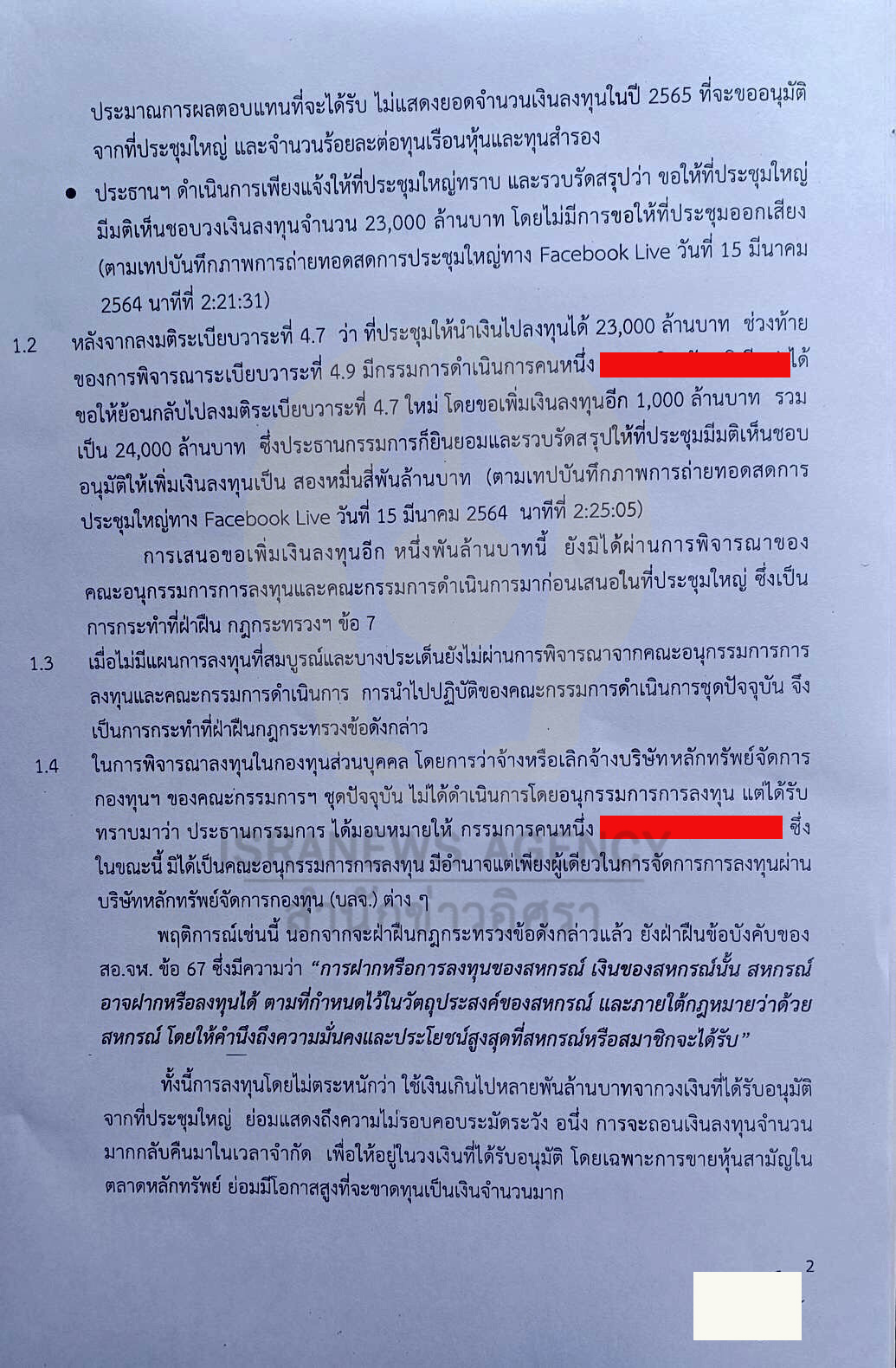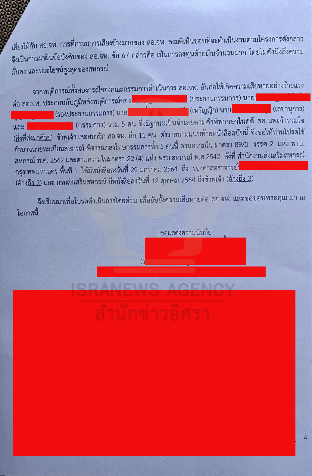การที่กรรมการเสียงข้างมากของ สอ.จฬ. ลงมติเห็นชอบที่จะดำเนินงานตามโครงการดังกล่าว จึงเป็นการฝ่าฝืนข้อบังคับของ สอ.จฬ. ข้อ 67 กล่าวคือ เป็นการลงทุนด้วยเงินจำนวนมาก โดยไม่คำนึงถึงความมั่นคง และประโยชน์สูงสุดของสหกรณ์” หนังสือร้องเรียนฯระบุ