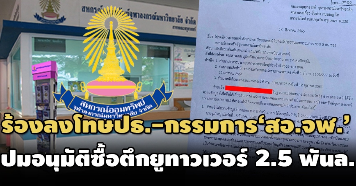 สมาชิกสหกรณ์ออมทรัพย์จุฬาฯ ยื่นหนังสือร้องเรียน ‘นายทะเบียนสหกรณ์’ ขอให้ลงโทษ ปธ.-กรรมการ ‘สอ.จฬ.’ ปมอนุมัติเข้าซื้อ ‘ตึกยูทาวเวอร์’ ของสหกรณ์คลองจั่นฯ 2.5 พันล้าน หวั่นทำให้สมาชิกสหกรณ์ฯเสียหาย
