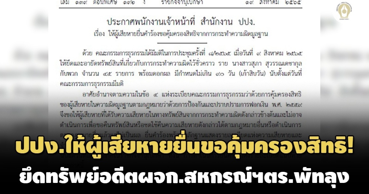 สำนักข่าวอิศรา (www.isranews.org) ราชกิจจานุเบกษา วันที่ 19 ส.ค.2565 เผยแพร่ ประกาศพนักงานเจ้าหน้าที่ สำนักงาน ปปง. เรื่อง ให้ผู้เสียหายยื่นคำร้องขอคุ้มครองสิทธิจากการกระทำความผิดมูลฐานระบุว่า