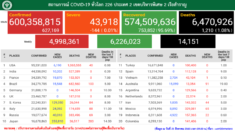 ขณะที่สถานการณ์ทั่วโลกพบผู้ป่วยเพิ่ม 627,169 ราย รวม 600,358,815 ราย อาการหนัก 43,918 ราย หายป่วย 574,509,636 ราย เสียชีวิต 6,470,926 ราย โดยประเทศที่พบผู้ติดเชื้อสูงสุด 3 อันดับ ได้แก่ สหรัฐอเมริกา ติดเชื้อใหม่ 6,190 ราย สะสม 95,331,020 ราย ตายเพิ่ม 40 ราย สะสม 1,065,555 ราย อินเดีย ติดเชื้อใหม่ 10,202 ราย สะสม 44,338,092 ราย ไม่มีรายงานผู้เสียชีวิต สะสม 527,289 ราย ฝรั่งเศส ติดเชื้อใหม่ 19,870 ราย สะสม 34,339,792 ราย ไม่มีรายงานผู้เสียชีวิต สะสม 153,501 ราย ส่วนไทยอยู่ในอันดับที่ 29 ของโลก